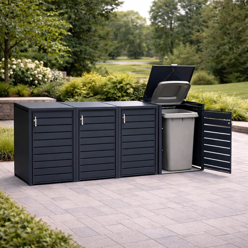 Minimalistična zasnova brez potiska omogoča, da se smetarnik neopazno vključi v sodobno ali klasično arhitekturo.