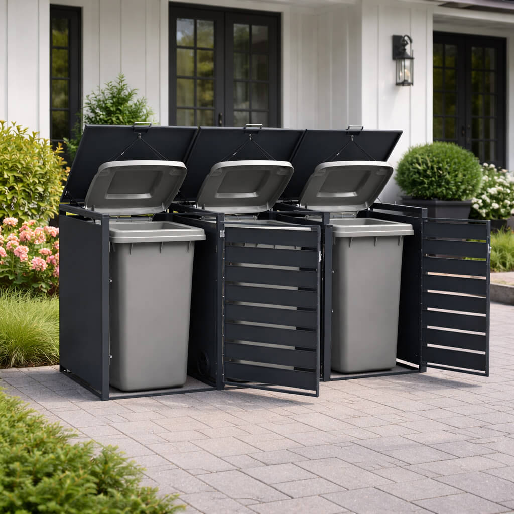 Minimalistična zasnova brez potiska omogoča, da se smetarnik neopazno vključi v sodobno ali klasično arhitekturo.